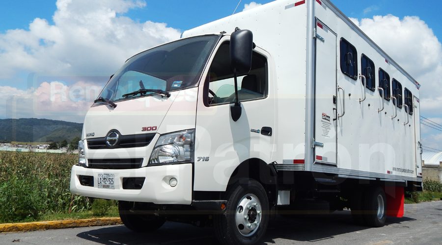 Cinco ventanas de lujo de aluminio para caballos con 4 funciones, camarote para caballerango, sillero, perchero rampa de ascenso/descenso de caballos con winch eléctrico, piso protegido con hule astriado, soclos de hule a 1m de altura 5 mamparas acojinadas, cámara de vigilancia con monitor en cabina, escaleras de camarote y caja retráctil