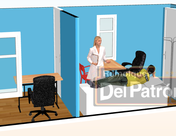 Dos áreas interiores para consultorios individuales con: mesa de exploración en color negro, pantalla de led 40 pulgadas, con puerta en cada consultorio, un clima de 8000 BTU tipo ventana (Frio/calor) en uno de los consultorios, una mesa tipo escritorio, una silla secretarial y una silla de atención a paciente en cada consultorio. Medio baño (tasa/tanque, lavabo, accesorios) con preparación para admisión de agua y desecho de solidos, tres repisas de lámina inox, una conexión trifacica.